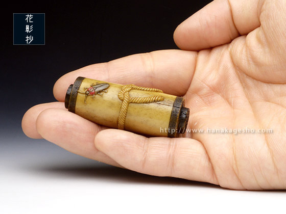 「“螢雪の功”という言葉があります。最近まで昆虫それ自体をメインのモチーフとして扱ってきたのですが、虫に関する故事を取り上げてみたらどうだろうと考え制作しましした。根付に限らずですが、どんな状況でも学ぶ心は忘れずにいたいものです」(カタクラケンタ)