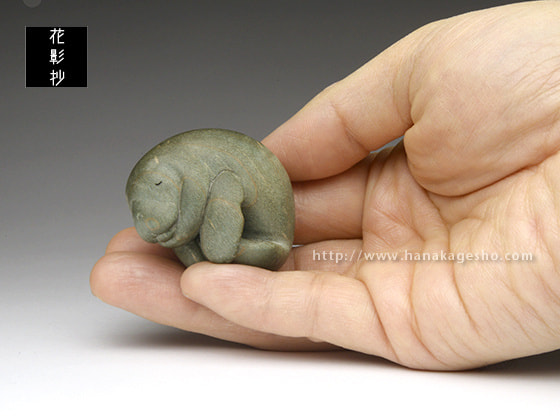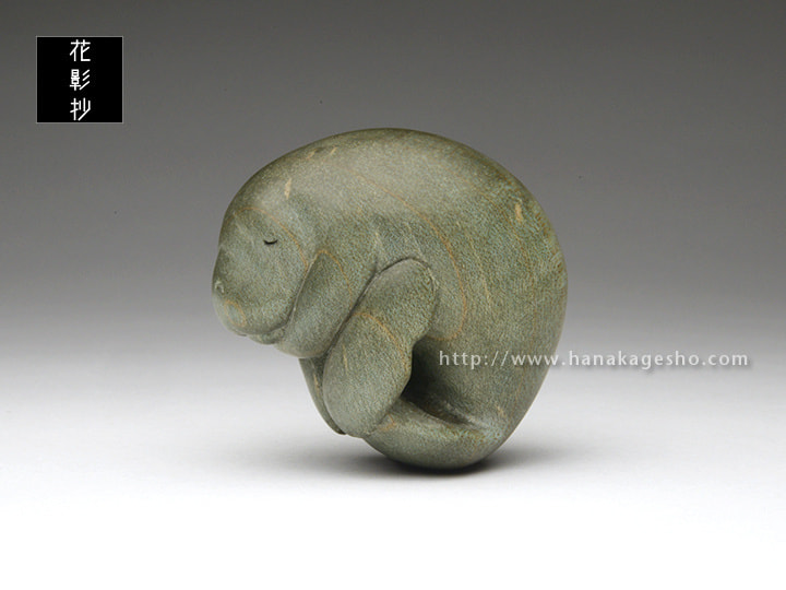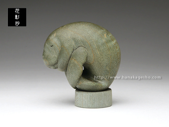 マナティが穏やかな海の中を漂いお昼寝している優しい風景です。楓の染色された木目が、水中での光の反射や波紋のように効果的に見えています。根付らしい丸いフォルムとサイズ感で手のひらになじみます。飾るときの台座つき。(根津の根付屋)