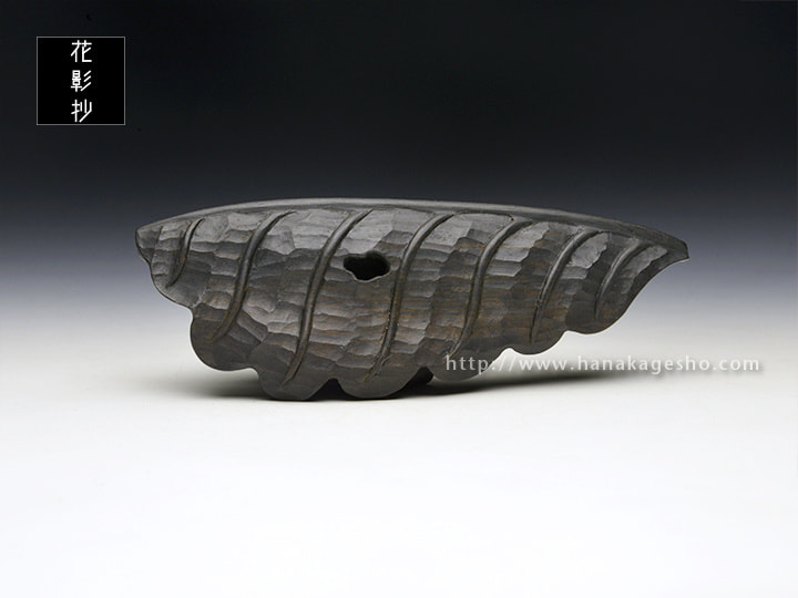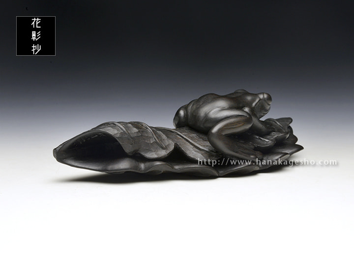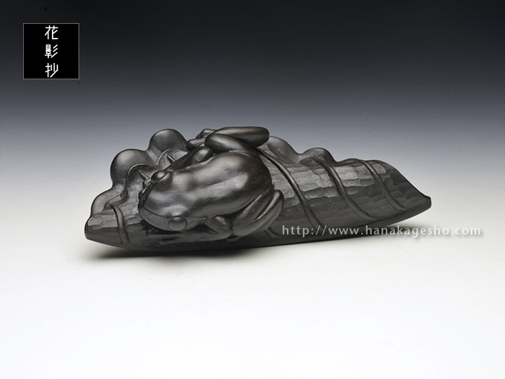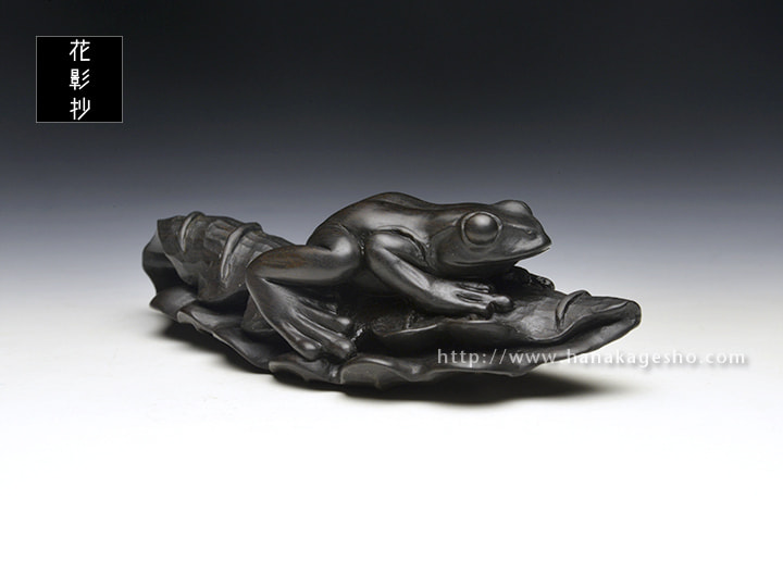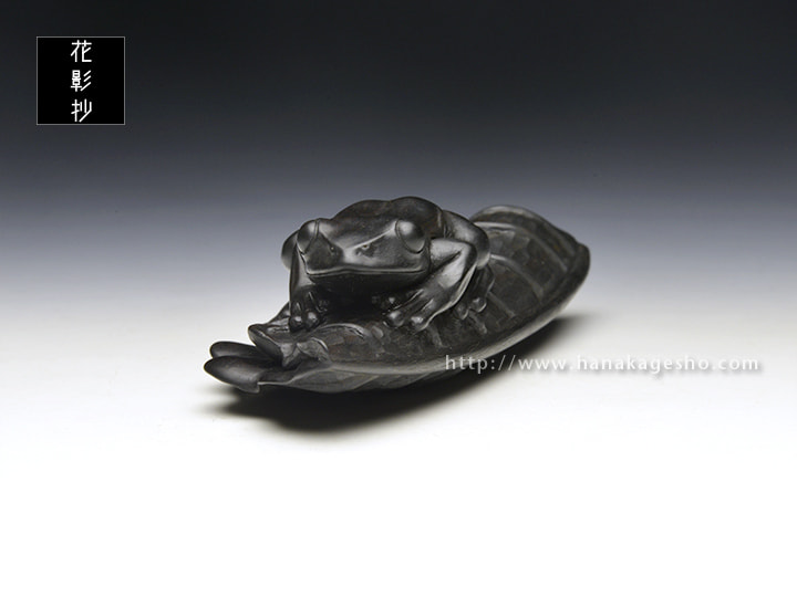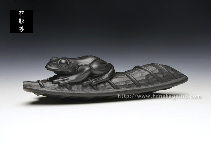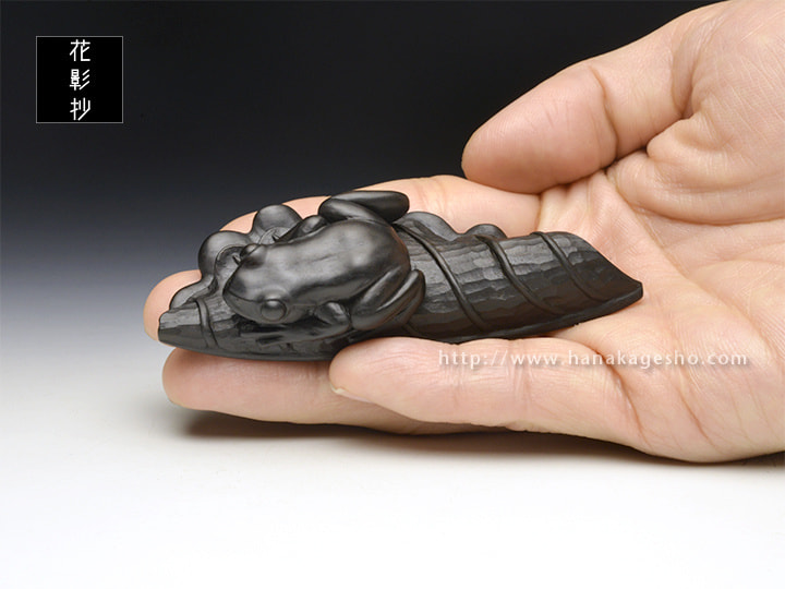 折り畳んだ葉っぱに蛙が乗るという構図が黒檀に合いそう、ということで制作した作品になります。 作者の私自身が寒いのが苦手なので、暖かい季節の到来を願いつつ柏の葉っぱにカエルが乗る様にしてみました。「蓮の葉に蛙」や「(壊れた)桶に蛙」といった造形はアンティーク根付作品でも散見される構図ですが、自分としてはひとつの型のようなものだろうなと認識しており、 実際に制作していくとなるほど根付として都合が良い要素が多く腑に落ちました。つるっとした蛙の肌と葉っぱの質感との差異を楽しんでいただければ幸いです。(カタクラ ケンタ)