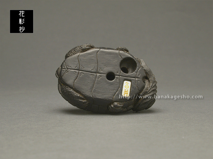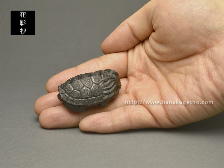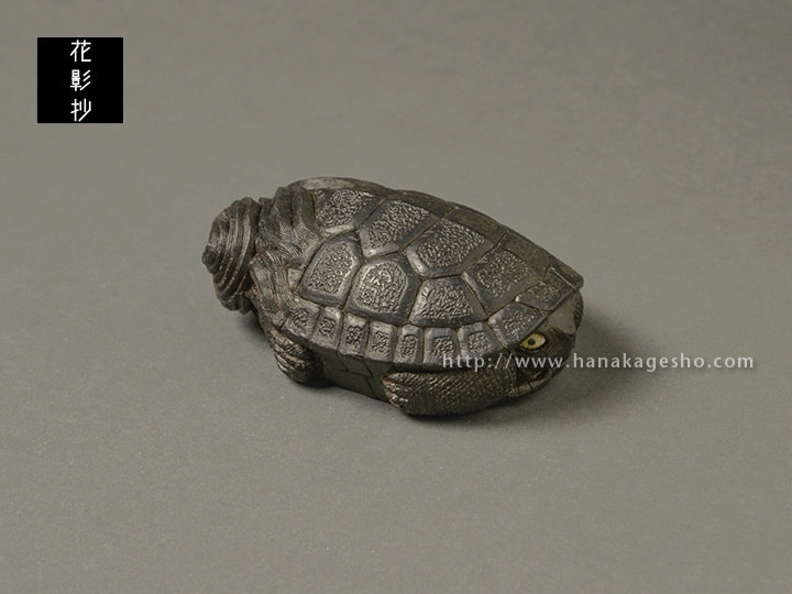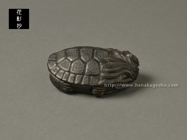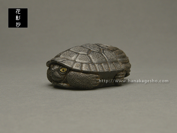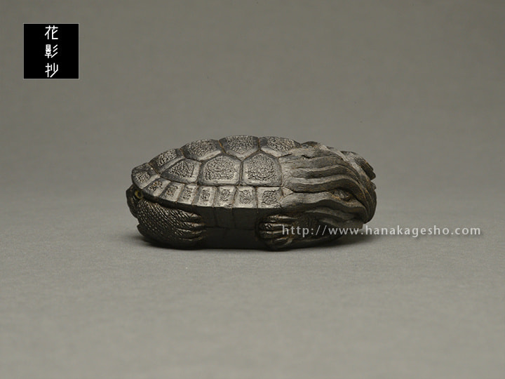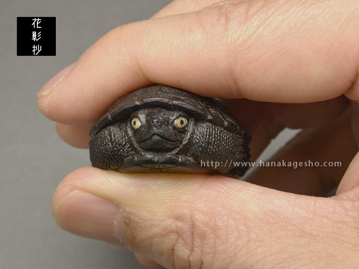 久しく縁起物を彫っていなかったなということで、蓑亀を題材に制作してみました。ここ最近の制作ではアンティーク根付作品を参考にすることも多くなってきているのですが、亀を題材にした作品は昔からかなり作られていたこともあり、自分なりに意図した造形を加えなければならないなと思い立ちました。黒檀という固いけれど手に馴染む素材なので、甲羅・蓑・手足を違う質感に彫ることで目で見るだけでなく触感を楽しめるような作品となっています。お手元でお楽しみいただければ幸いです。