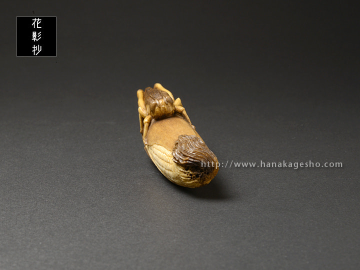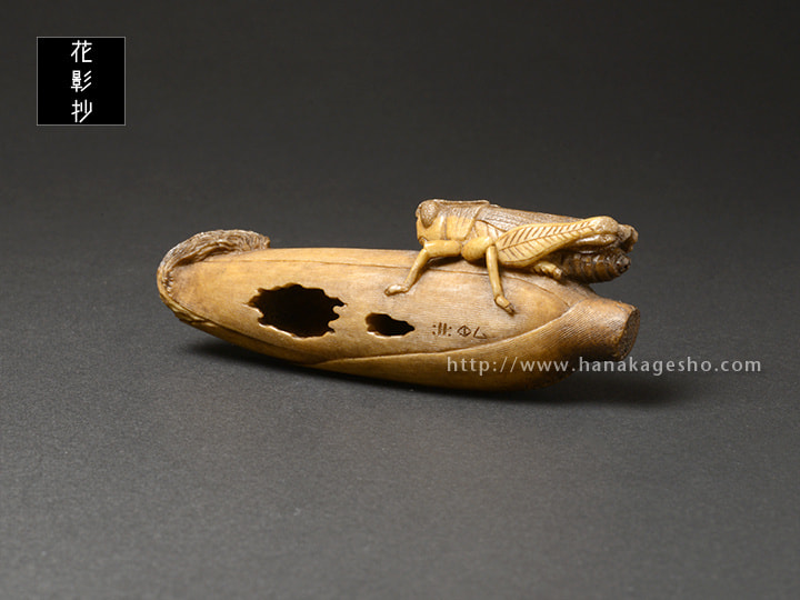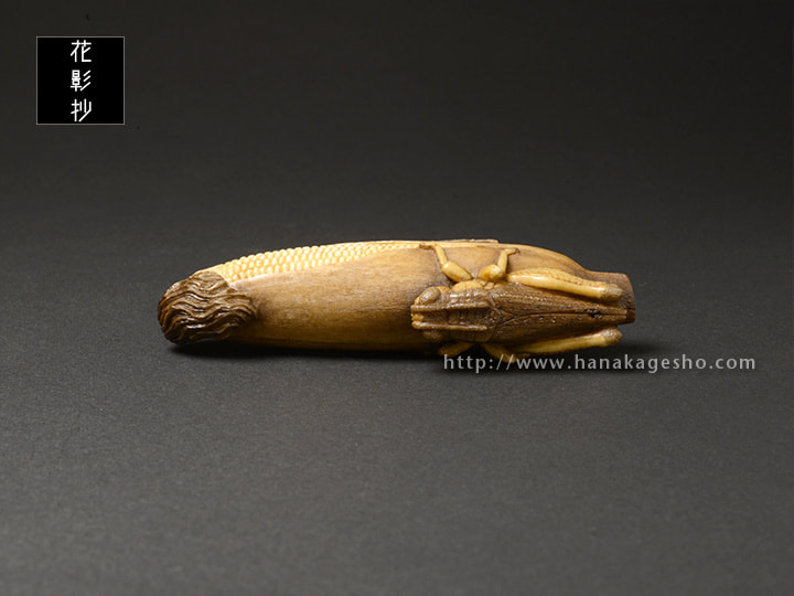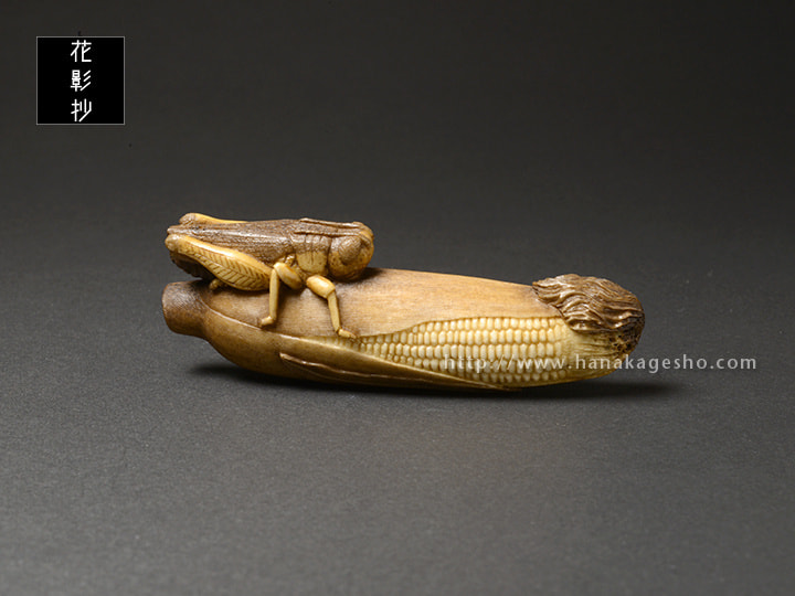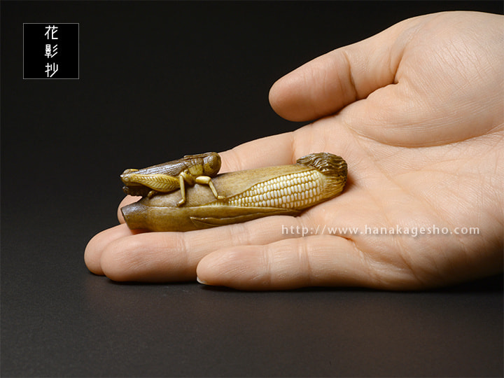 今回はとうもろこしにイナゴ、というテーマで彫刻してみました。美味しそうな野菜に虫が留まるアンティーク作品にも見られる構図を真似つつ、私たちが生きている時代性を映すようなモチーフとしてこの組み合わせはどうか?と選択しています。完成してから知ったのですが、秋田県のほうではどちらも美味しく食される食材という話を聞きました。その話を聞くまで全く無意識だったんですが、子どもの頃に祖母に食べさせてもらったイナゴの佃煮の印象が、この作品で彫られているイナゴの大きさとピタと重なり自分で驚いています。年を重ねた自身が知識や経験を元に考えた作品でありながら、どこかで幼少期のカタクラ少年の記憶と接続した作品になったのかなと感じています。(カタクラケンタ)
