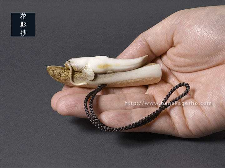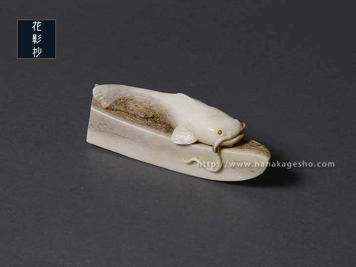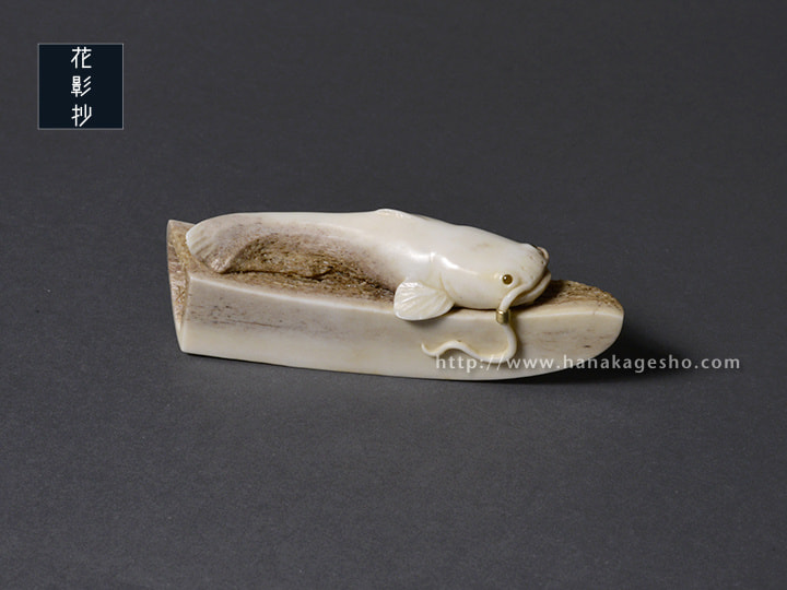 今回のモチーフにはナマズを選んでみました。古来、日本においてナマズは地震と縁が深い生き物として語られてきたことはご存じの方も多いかと思います。やはり根付においてもアンティークから現代に至るまで普遍的な題材として扱われてきました。今作品では、先達の根付作品群で散見される尾鰭に向かって体躯が丸まっていく構図ではなく、牙型の土台の長さを活かして伸びやかでリラックスしてるようなナマズを目指しました。また、何か現代的な装飾の要素を入れてみようということでヒゲにワンポイントを入れてみています。写真では全貌も伝わりづらいかと思いますので、ぜひ直接ご覧いただければ幸いです。(カタクラケンタ)