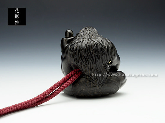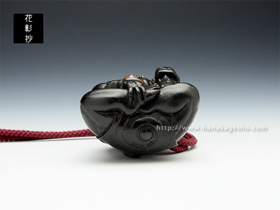子猿鏡蓋根付「吉、引きました。よし!!」