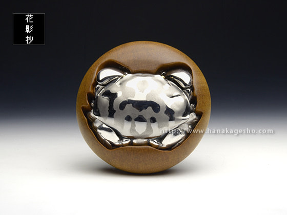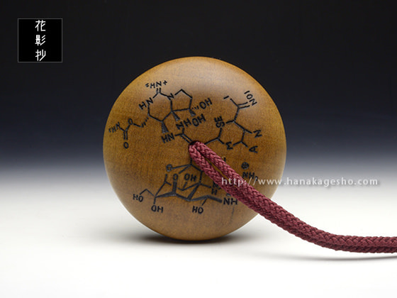「饅頭根付にスベスベマンジュウガニが付き、滑々饅頭根付となります。このカニは毒を持っており、毒饅頭ということになります。裏にはその毒のテトロドトキシン、サキシトキシンの構造式があり、毒饅頭であることを示しています」(万征)