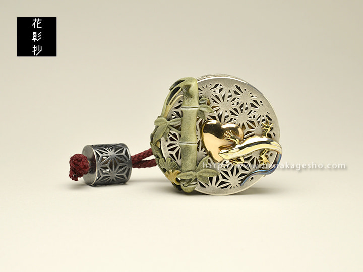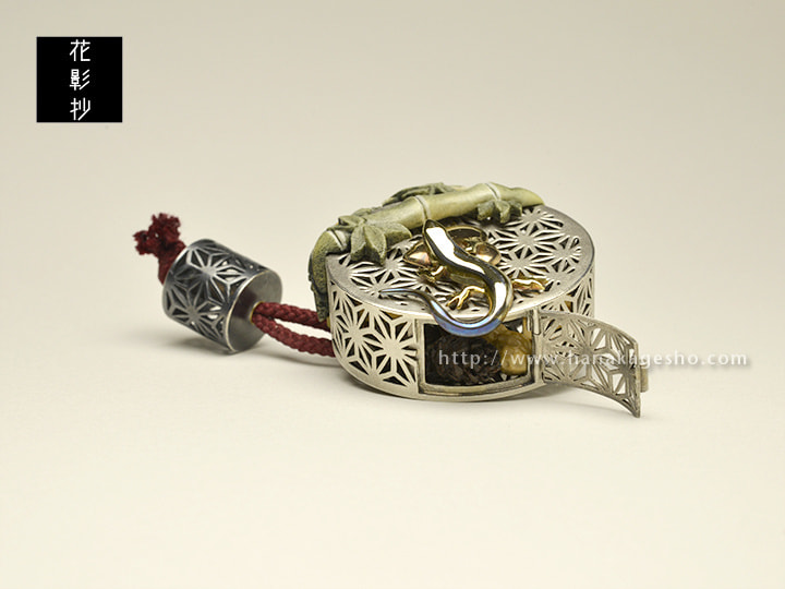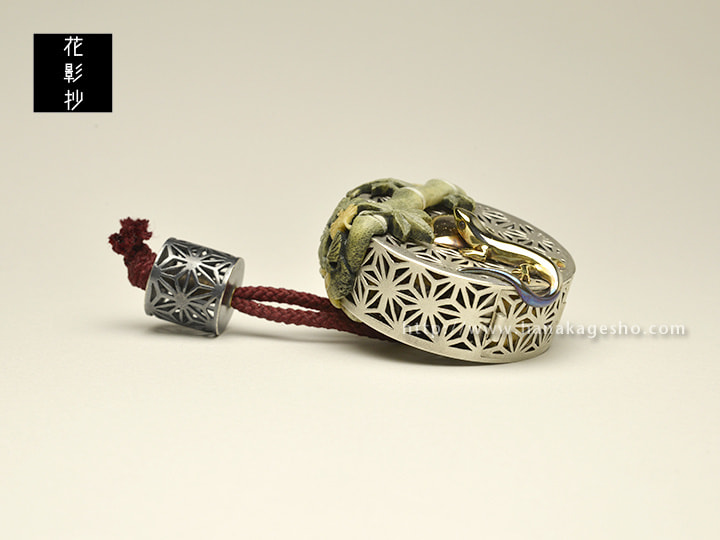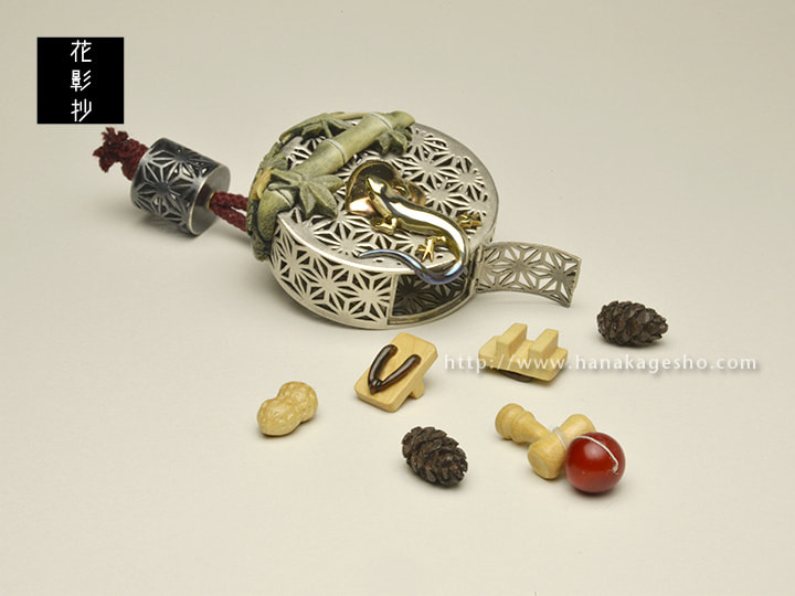 子どもから大人まで誰もが楽しめる言葉遊び「しりとり」は、言葉を途切れることなく繋ぐことによって結界をはり魔除けの効果があるとされていたようだ。そんな「しりとり」遊びと御守りを兼ねた根付になりました。麻の葉→ハート→蜥蜴→下駄→竹→けん玉→松かさ→桜→落花生→銀杏→内歯車→万征。