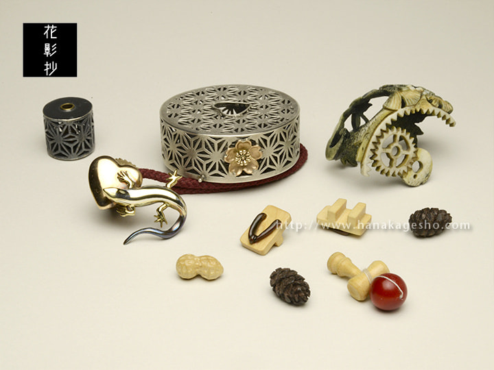 鹿角、925銀、銅(ハート)、黄銅・925銀・赤銅(トカゲ)、黄銅(歯車)、黄楊(下駄、けん玉、落花生)、黒檀(松かさ)、象牙(けん玉の玉)