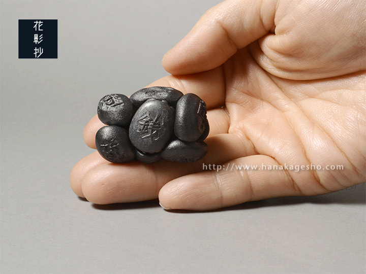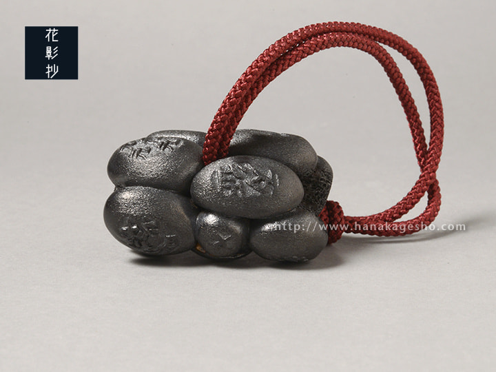 この作品をよく見ると、豆板銀の塊の中に銭亀が……!! その頭と尻尾が動く仕掛けになっています。金運アップのご利益が込められた根付です。 |