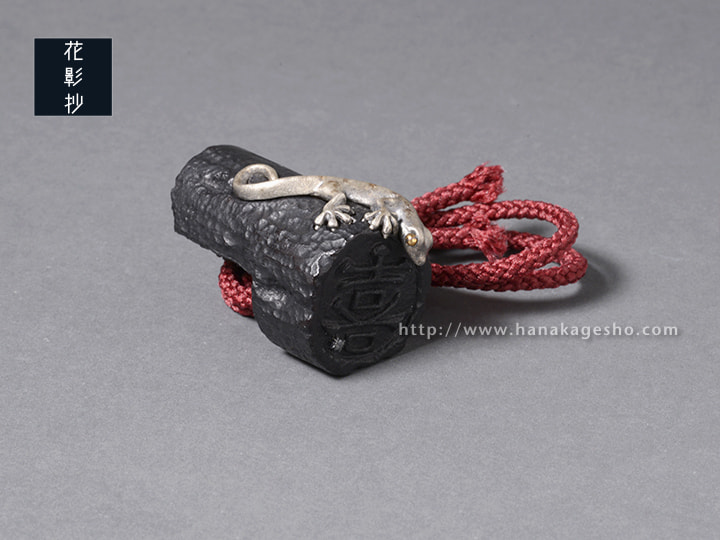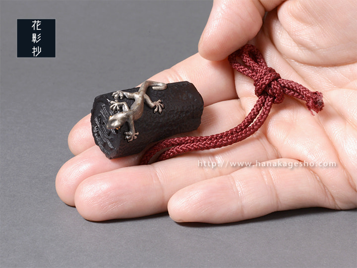 "喜"の文字が入る古びた巴瓦。そこに潜む蜘蛛。その蜘蛛を見つめる守宮。瓦をめくるとムカデの姿。吉祥トライアングル。正阿弥勝義の「古瓦鳩香炉」にインスパイアされて制作した作品です。