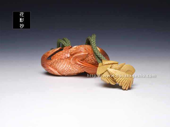 ヘラジカ角 象嵌:表側の目(琥珀、松煙樹脂、金箔)、裏側の目(水牛角、鹿角)