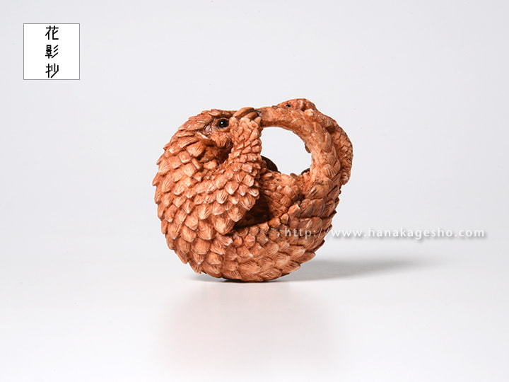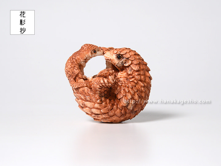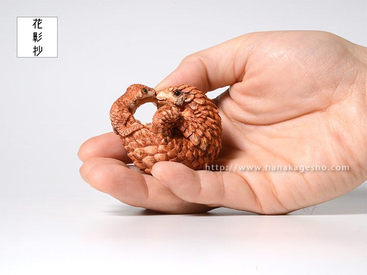 「僕が見て、触ったことがあるのは今回のモチーフであるミミセンザンコウという種類のセンザンコウで、あとのセンザンコウは憧れの存在だ。今回のは憧れではなく、友だちのような隣人のような、それとも僕自身の分身のような、とても近くに思っている存在。だから情景や心情を前のセンザンコウ2作よりも込められた(自然と込めてしまった)作品になった。去年から続いている親子をテーマにした根付の中でもとてもとても僕自身に近く、思い入れの強い作品になってしまった
