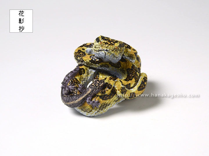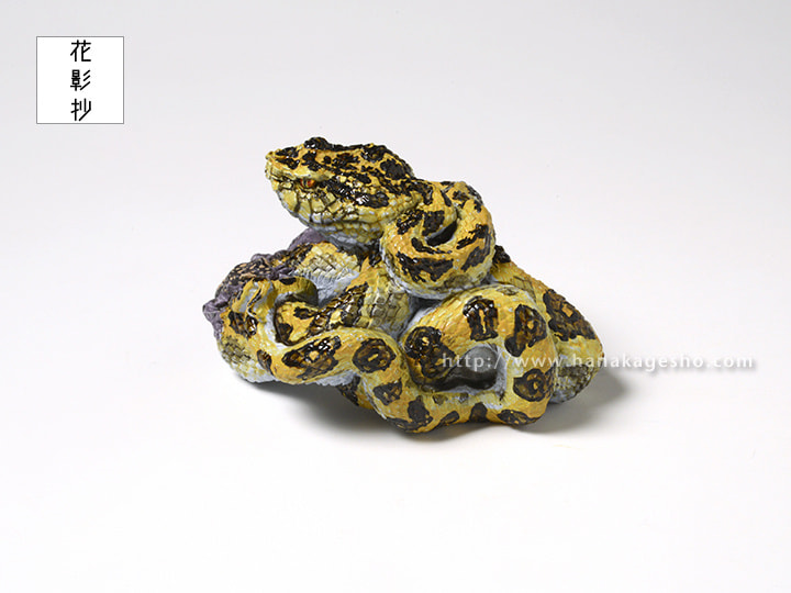 干支根付「巳」について 巳、ヘビです。 この干支根付は個人的な思いを盛り込んで制作しておりますが、今年もそのように作っています。モチーフはハブ(ホンハブ)とクロイワトカゲモドキでどちらも沖縄に生息する爬虫類です。どちらも沖縄県北部のやんばる等で見ることができますが、僕が見ることができたのはクロイワトカゲモドキだけで、ホンハブはまだ野生では未見です。いつか見てみたいものだと思っています。ホンハブは一般的に知られている毒蛇というイメージだけではなく、日本で最大級の大蛇でもあります。また黄色と黒のまだら模様はとても美しく、個人的には全ヘビ中で1、2を争う美しさ、かっこよさだと思っています。そういうハブを一度きちんとした形で作りたいと思っていたので、今回の巳年のモチーフとして迷わず選びました。特に頭部の鱗の配置、その綺麗な並びが独特で見ていただきたいポイントです。 新作「巳」根付と新しい年をお迎えいただけましたら嬉しく思います。( 守亜) |