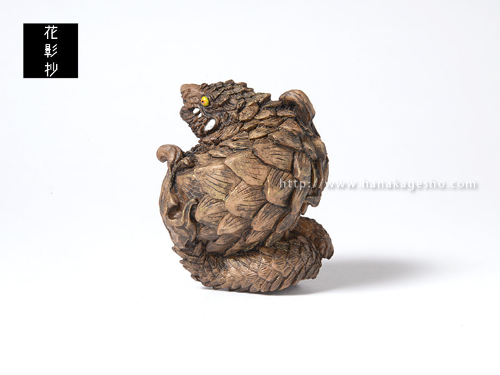 去年台湾の妖怪図鑑を手に入れて眺めているうちに何か作りたくなってしまって、結局、やっぱり、センザンコウ系の妖怪を選んでしまいました。その本によると金鯪鯉が現れると豊作になるとのことで大事にされているおめでたい妖怪だそうです。台湾に生息しているミミセンザンコウをベースにしつつ、各所に妖怪っぽさを散りばめました。顔は妖しさの中に威厳を感じさせるような雰囲気で、牙を生やしたのはご愛嬌で。でもカッコいいんじゃないかと思うんです。 (守亜)