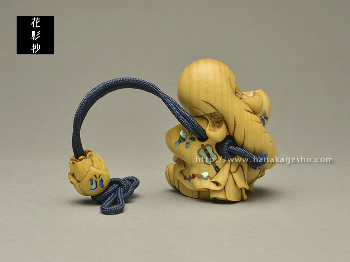 歌舞伎でお馴染みの“鏡獅子”の場面で、牡丹に戯れる蝶が、やがて胡蝶の精となり、獅子にまとわり、髪を振り回す“毛振り”を参考にしてみました。鏡獅子を演じる歌舞伎役者と獅子。クライマックスの “毛振り” の場面で、うっかり獅子の尻尾を踏んでしまい、怒った獅子が目の前の髪を咥えたところ、役者が髪を振り回すにも、どうにもこうにも振り回せず、ごまかしついでに、見得を張りながら、もがき苦しんでいる様子を図にしました。役者の衣装には、蝶とともに獅子とのせめぎ合いを表現する軍配を螺鈿と木材で象嵌し、また、牡丹の蕾を緒締にしてこちらも蝶を螺鈿象嵌しました。(加賀美光訓)