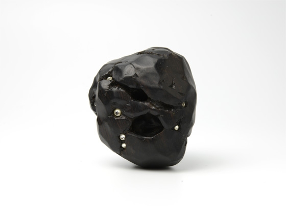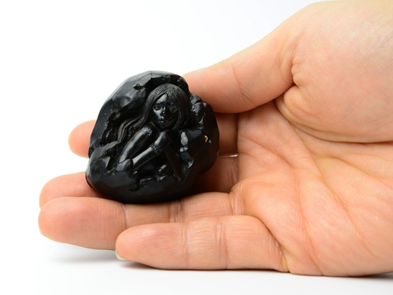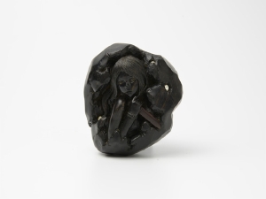 「永島の黒檀の女性像シリーズ。瞳のべっ甲象嵌は潤いのある表情を、本体のスワロフスキー象嵌は、闇の中に光が内包されているような、地底の岩の中に鉱物が眠っているような神秘的なイメージを喚起させます。べっ甲の短剣を握りしめたフォルムには、美だけでなく野性的な強さが、髪の毛には生々しさが宿る女神像に仕上がっています。紐穴も岩の自然な形になじんでおり、結ぶ目を収納するしっかりした大きさです」(Gallery花影抄/橋本達士)