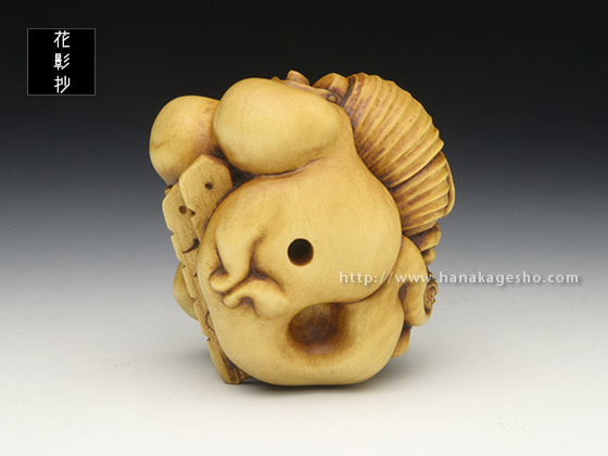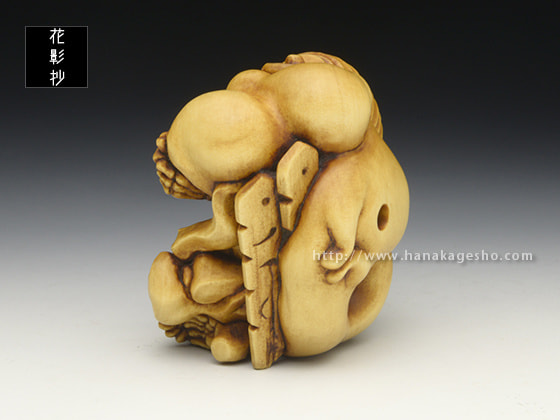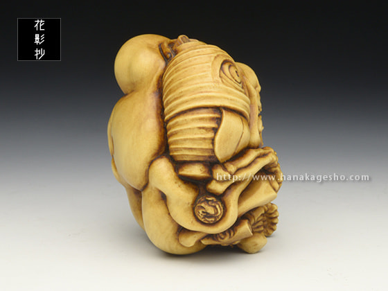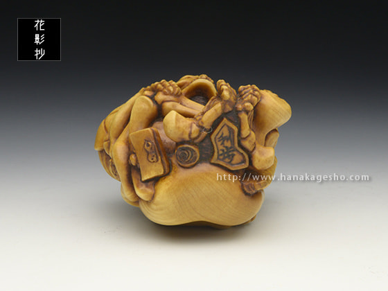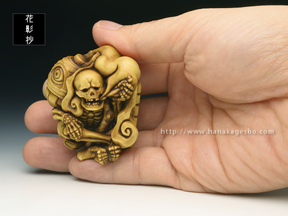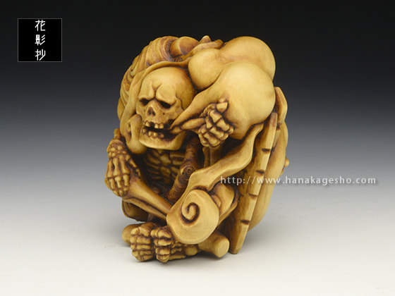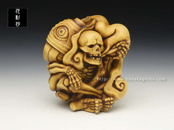 「お化け屋敷の役者仕事で疲れてしまい、休息中の髑髏の根付を制作しました。小道具の提灯お化けを肩に担いでおり、その後ろには本物のお化けが…という場面になっています」(利歩)