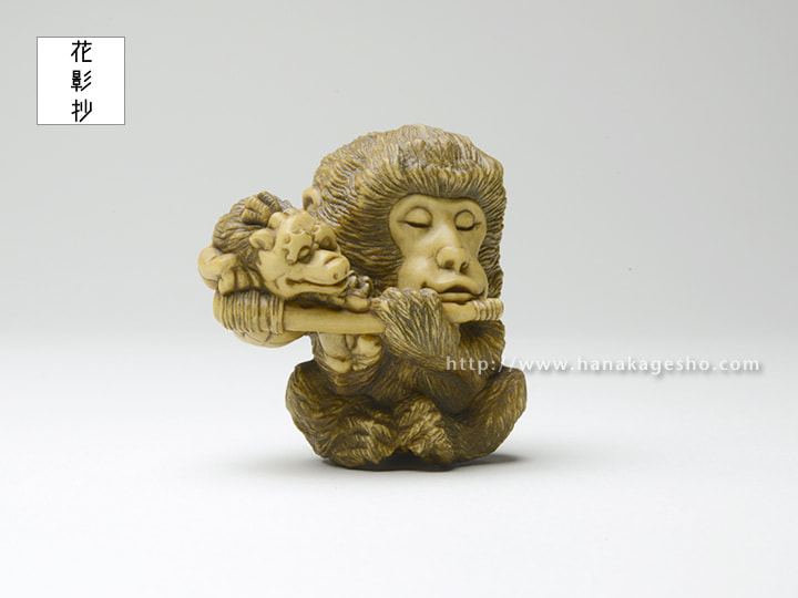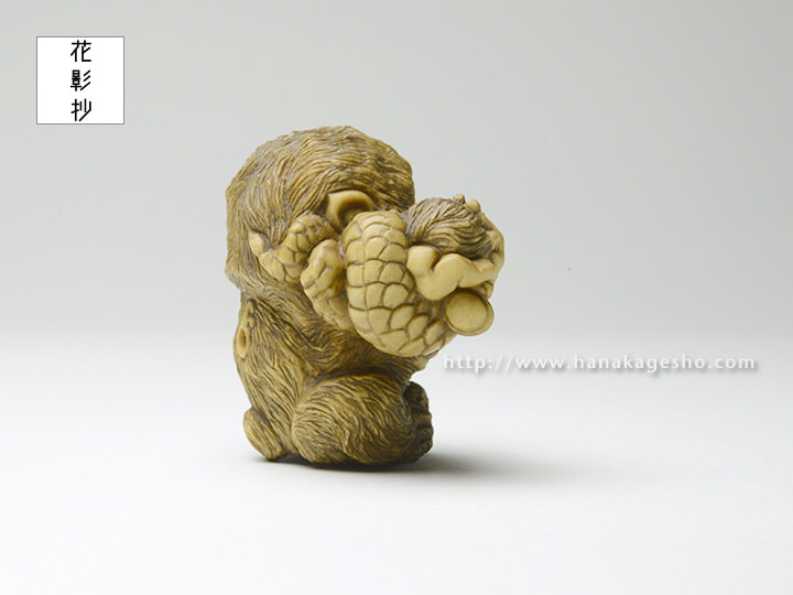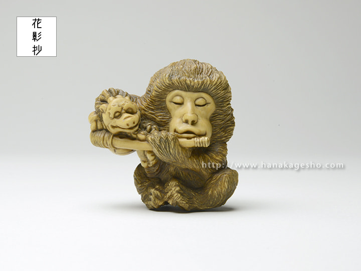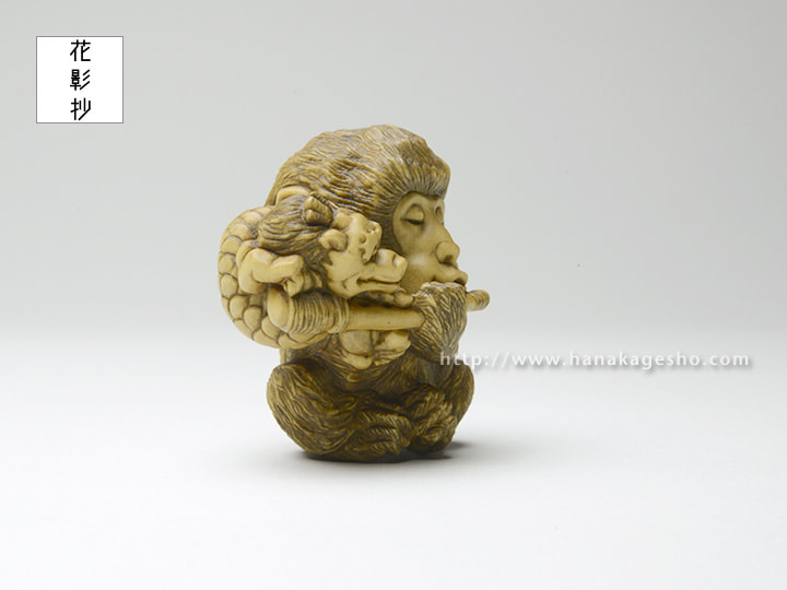 龍仙人という根付の題材がありますが、その龍仙人の外出中に、山の子猿が山道で見つけた篠笛の音色を、仙人の龍の子と一緒に楽しんでいる様子を根付にしました。楽しんでいる子猿の顔や、(少し自分なりの)毛並みの表現に苦労しましたが、ほのぼのした楽しげな雰囲気が出せたかなと思っています。紐の出る側の穴には、龍が水の神であることから、水が跳ねているデザインの紋様を彫りました。