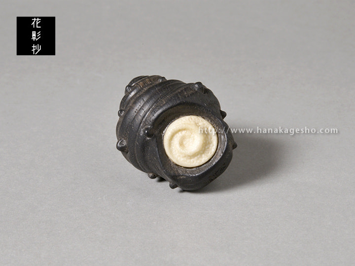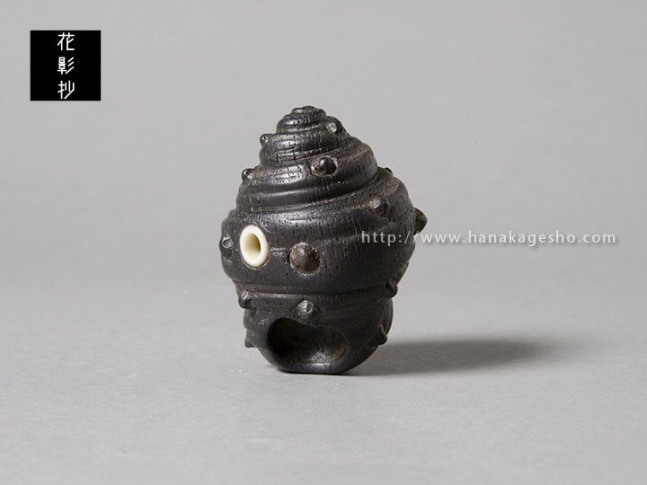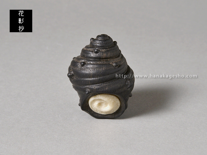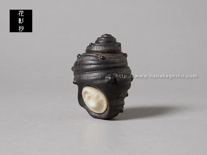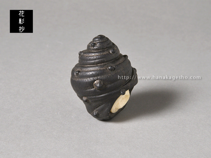 戦国期の変り兜、栄螺形兜(さざえなりかぶと)の風合いを取り入れた、黒い栄螺の根付です。栄螺は、殻の硬さが具足の強度の高さを想像させ、また「栄」の字が縁起の良いことから、武将たちは栄螺の造形を好んでいたとのことです。