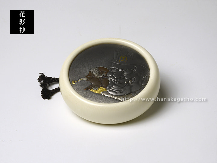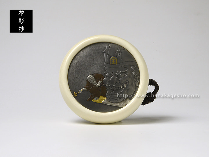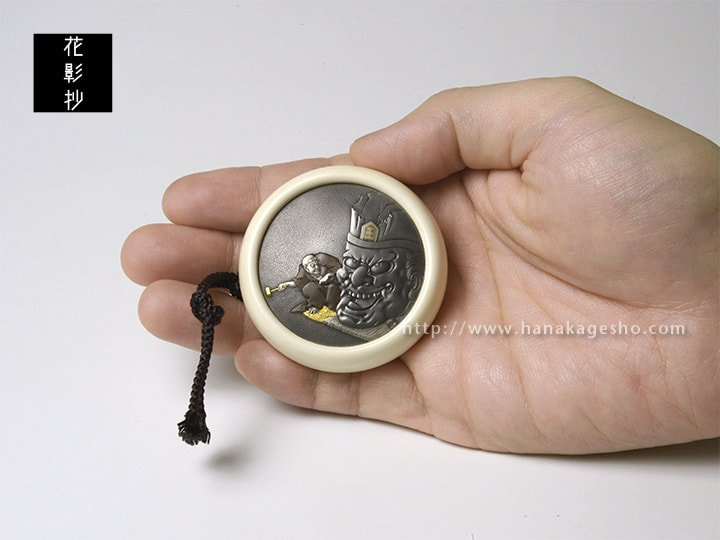 河鍋暁斎の絵図を元に制作。描かれているのは、彫師が熱心に閻魔大王の頭像を彫刻している様子。構図は、閻魔大王が根付全体のほぼ半分を占め、閻魔の頭と彫師の全身が同じ大きさになっていることからも、閻魔大王の威厳と重厚感を感じる。