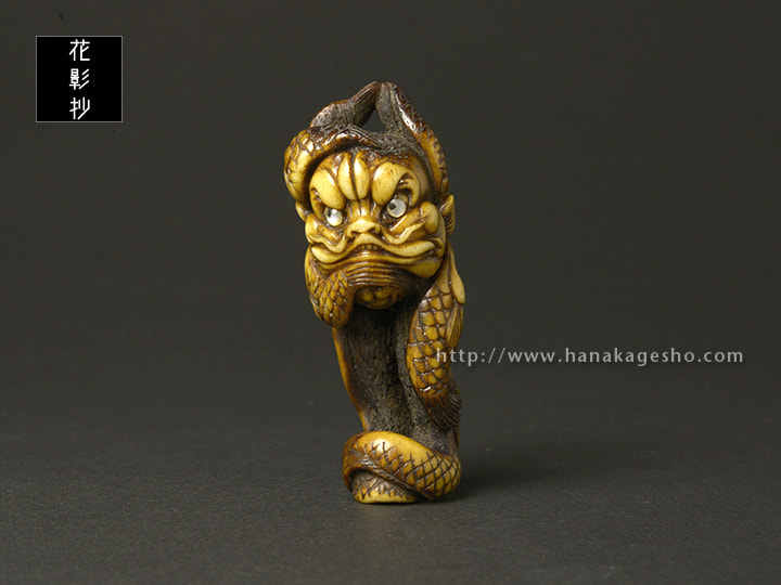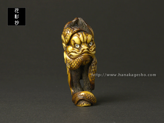 私は、何罗鱼(何羅魚)を川神としてデザインしている。 顔は考え込むような真剣な表情で、10の胴体が背中から回転して出てくる形になっている。10体のうち、2体がバランスを保つように立ち、2体が頭頂で合掌、2体が「考える人」のように膝と頭に抱えて、ほかの4体は回転させて作品に活き活きとした動きを与えている。(子竹) |
