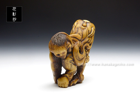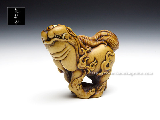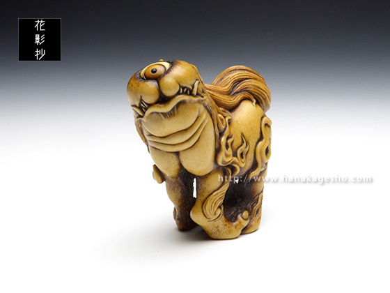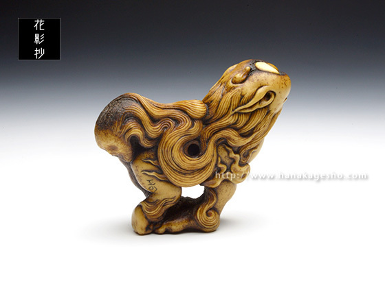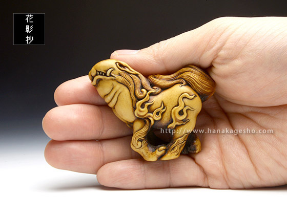 「根付のタイトル《霊獣 耆驪目》(れいじゅう しりめ)ですが、 “耆”は老いるの意、“驪”は黒毛の馬のこと、“目”はそのまま尻目の“目”です。“老成し黒馬の如き姿の霊獣と成った尻目”を意味する当て字です」(至水) |