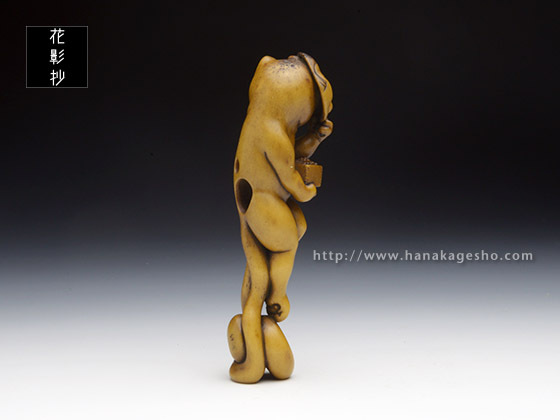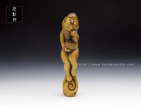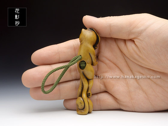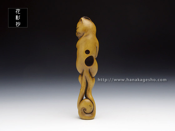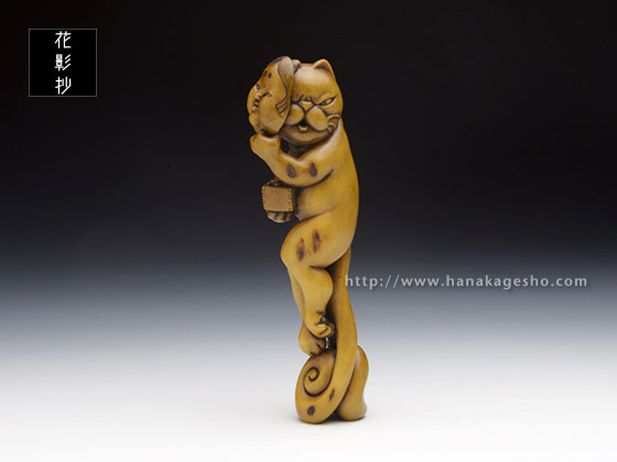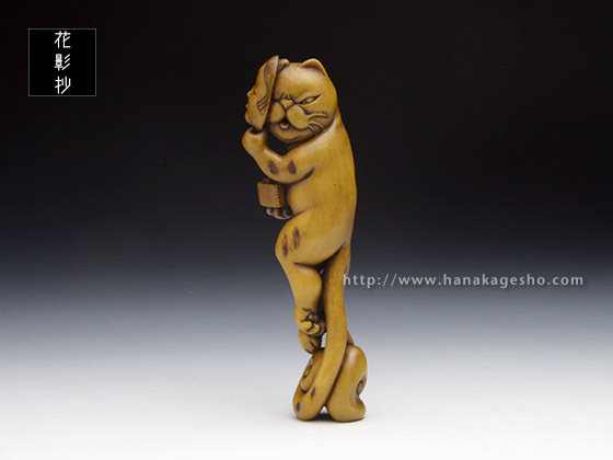 「2017年2月に時節モノの根付として製作した古典根付の意匠“鬼やらい”と至水の好物“猫又”のマッシュアップで爆誕した根付《猫にゃらい》。 |