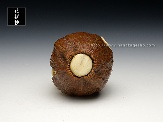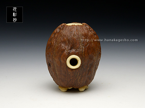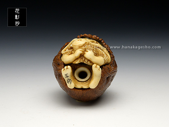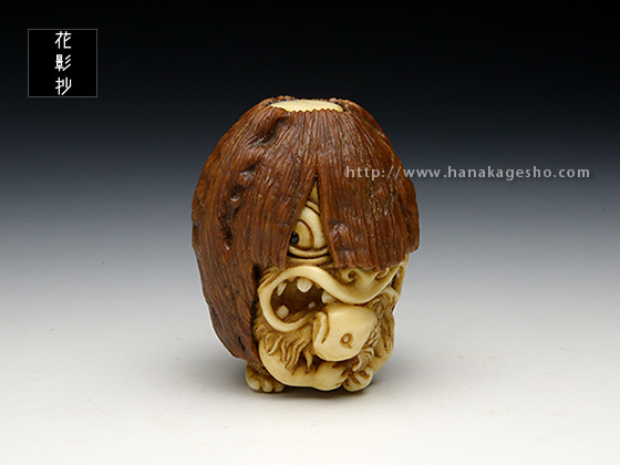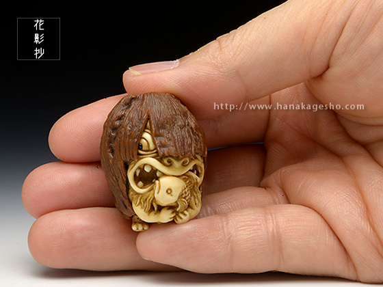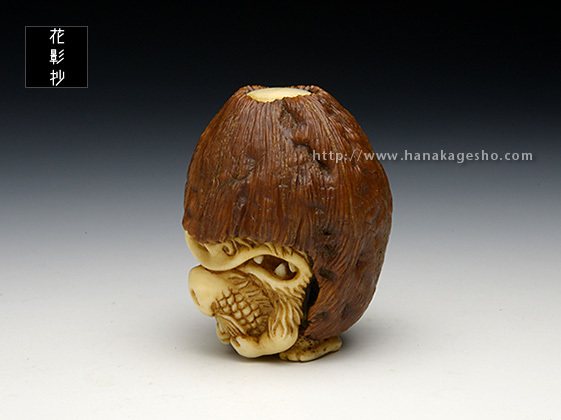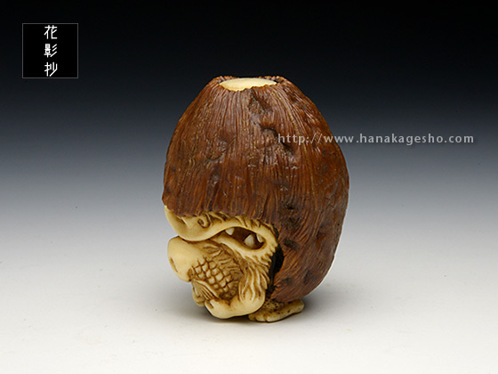 河童は全国各地に伝承が残る妖怪ですが、その土地土地で姿形の違いが見られます。「猿猴」は広島や中国、四国地方に伝わる妖怪で、全身毛むくじゃらの河童の一種です。製作当初「魚に齧り付く河童ヘッド」を彫っていた筈なのですが、胡桃の丸さに導かれ気が付けば手が生え足が生え、ほぼ一頭身のキャッチ―な水妖が爆誕しておりました。本当に・・・胡桃は良いものです。(至水)
