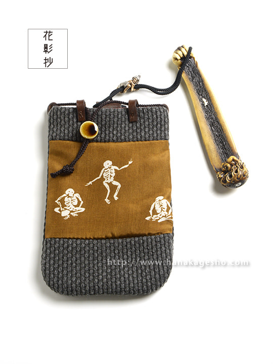 巾着制作:れんげ堂 15 × 9 cm 木綿刺し子墨染、古布、皮革、陶