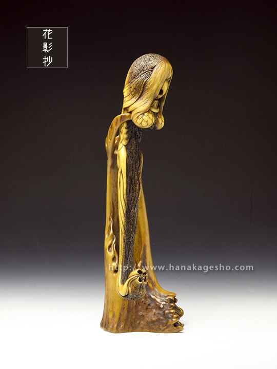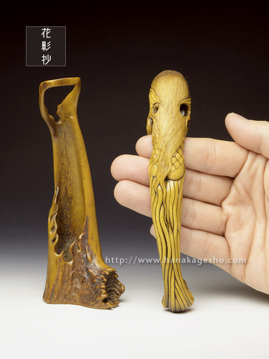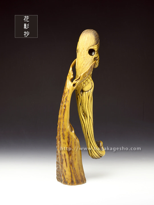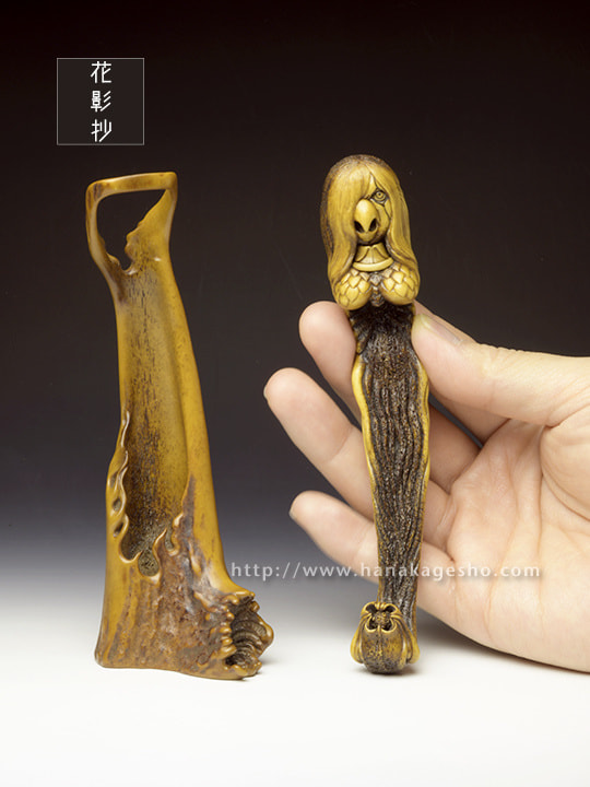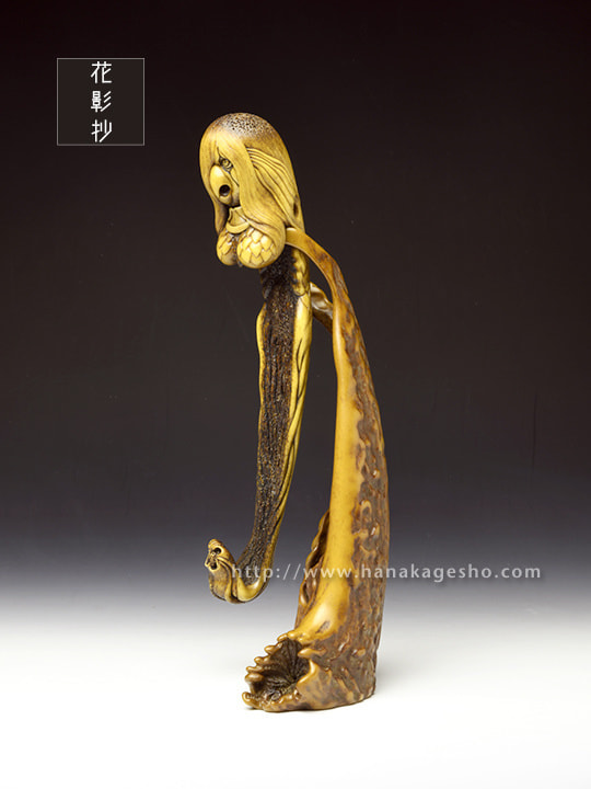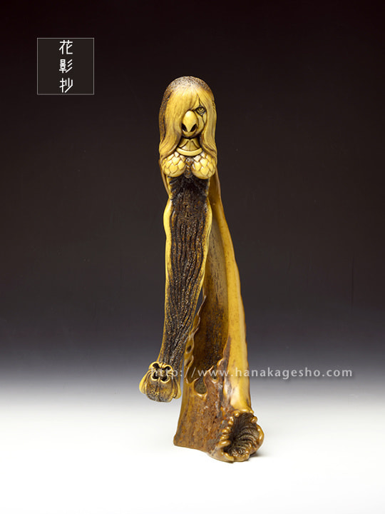 人間には辿り着く事すら叶わぬ11,000mの超深海の最深部、海淵に拡がる広大な深海樹林の中央には、大海洋神が祀られた社と正対するように一株の朽ちた深海樹が植えらている。朽ちてなお生き永らえるその深海樹には廻魂蟲が同化寄生しており、とめどなく新しい生命の種を海洋に放散し続ける、謂わば生命の原木なのだ。2020年初頭、コロナ禍第一波の拡大が加速するなか、MESSIAHの依頼を受けた大海洋神の手によりSARS-CoV-2の遺伝情報を封入された楔状の依代が生命の原木に打ち込まれた。あれから半年が過ぎ、廻魂蟲の体内錬成により「生き物」として転生させられたSARS-CoV-2の肉塊が遂に口洞から吐き出され静かな産声を上げた。「あなたに恨みはないけれど、これが地球意思の結論、創造神はまた未熟な人類の救済を選択してしまったの」そう呟き、深海漂うSARS-CoV-2を三枚の鰭でそっと包み掬い上げたアマビヱは、この「生ける形代」を届ける為にMESSIAHのセントラルシャーマニズムセンターへ急ぎ向かうのであった。差し根付「アマビヱ」完成です」(至水)