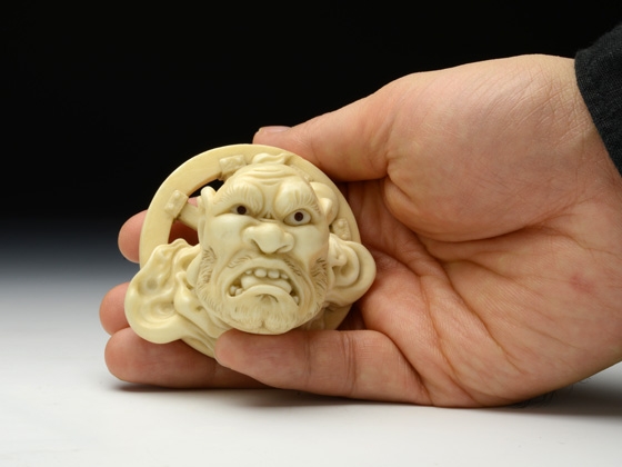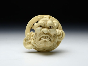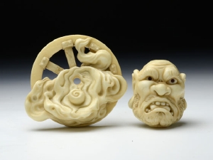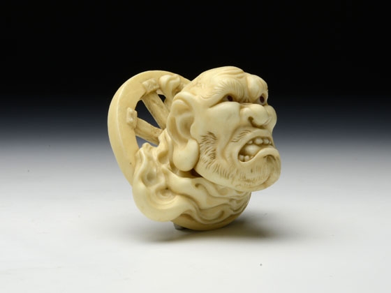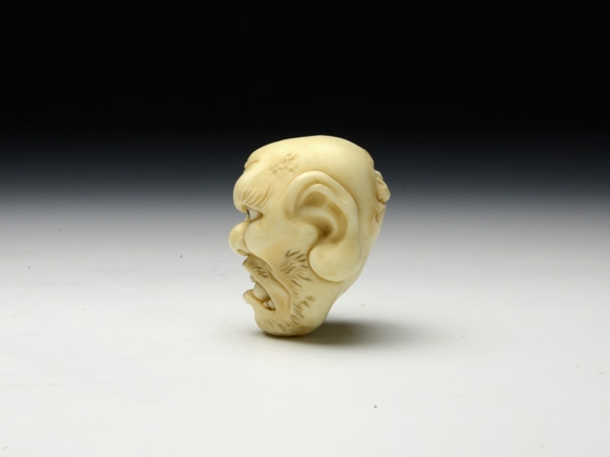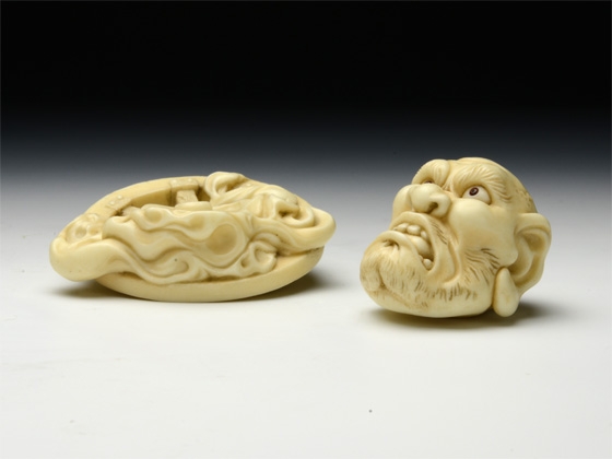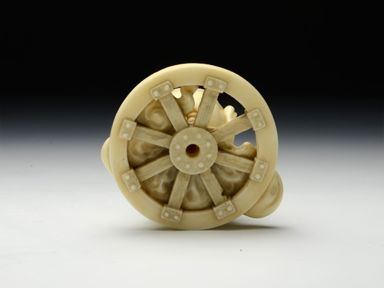 「根付『WND ー輪入道が脳挫傷、脱輪しちゃったからー』。『WDN』改め『WND』花影抄エディション(アイボリー風味)です。『WND』に改名したことで wa-nyu-dou の頭文字に対応! why not do? (やらないかぁ?)……リーズナブルな樹脂の根付なんてという隠喩も有ったり無かったり……」(至水)