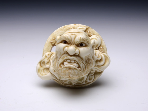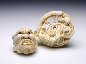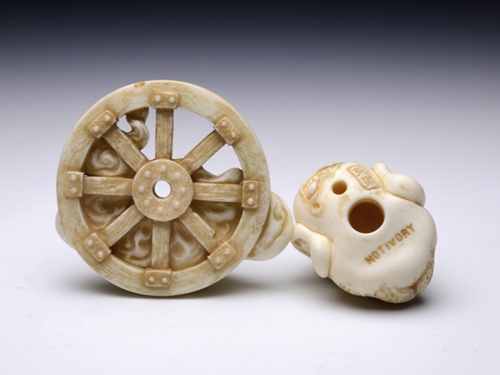 「根付『WND ー輪入道が脳挫傷、脱輪しちゃったからー』。『WDN』改め『WND』花影抄エディション(アイボリー風味)です。『WND』に改名したことで wa-nyu-dou の頭文字に対応! why not do? (やらないかぁ?)……リーズナブルな樹脂の根付なんてという隠喩も有ったり無かったり……」(至水)