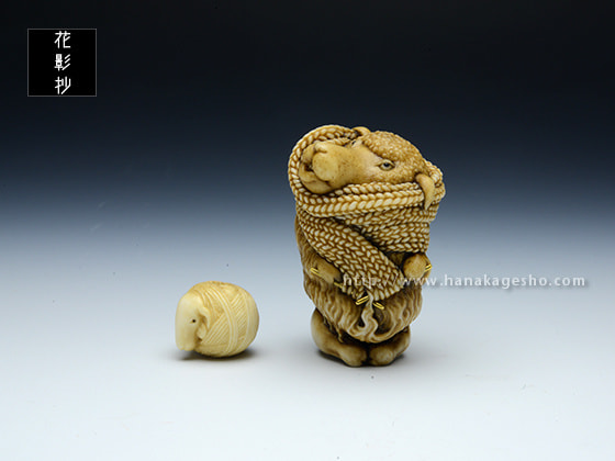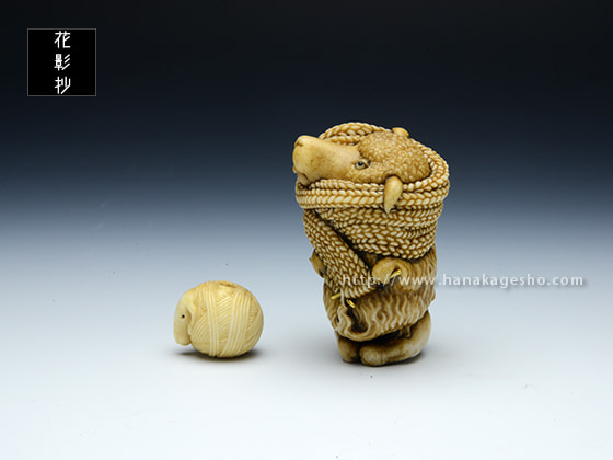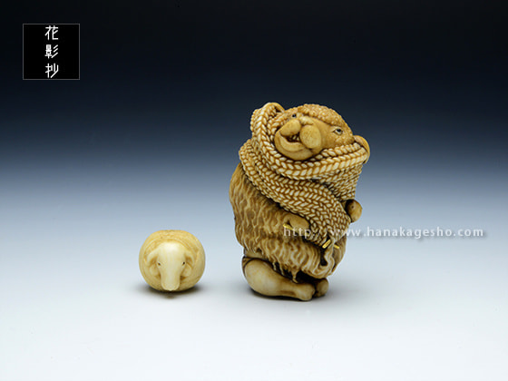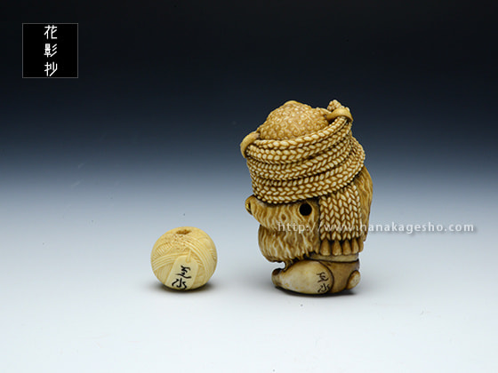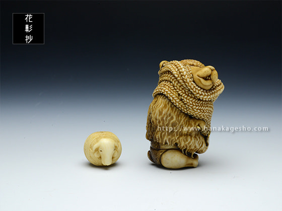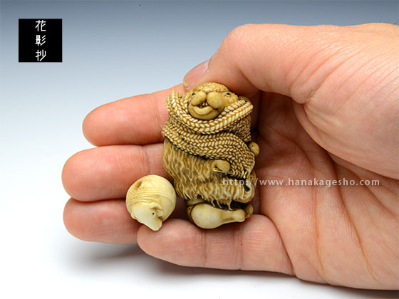 根付:2.8 x 2.6 x 4.3 cm、緒締:1.7 x 1.5 x 1.4 cm