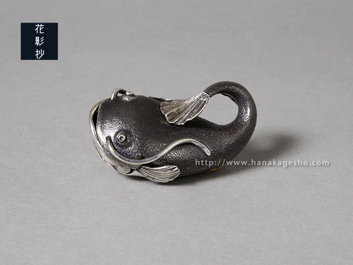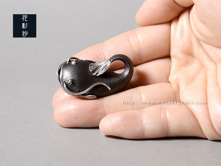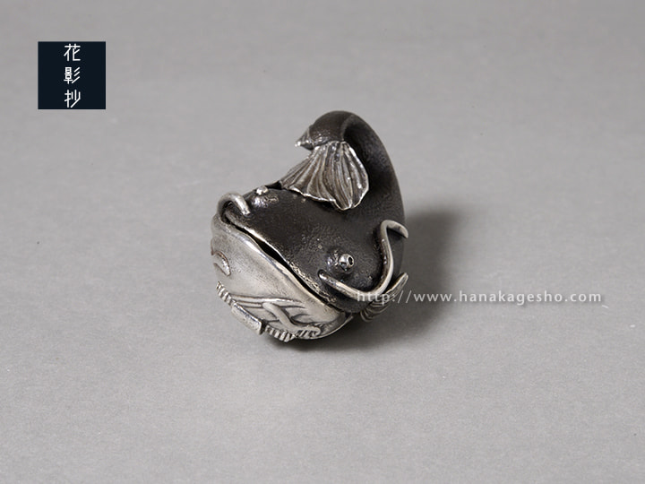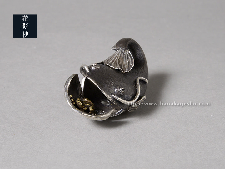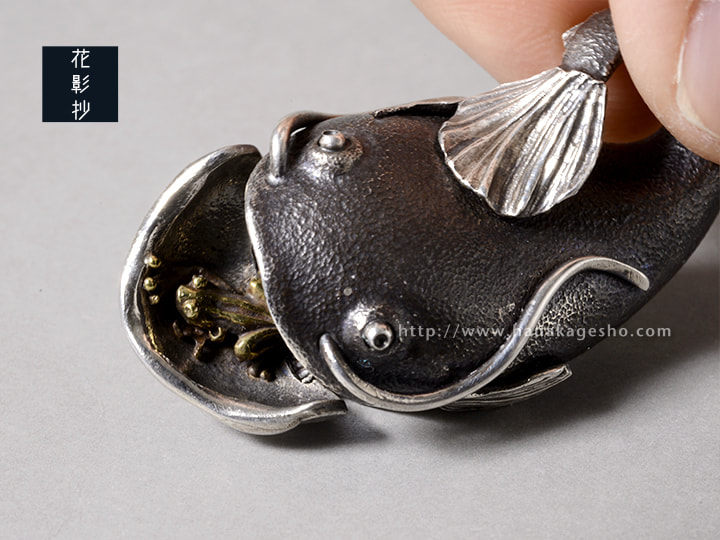 口を開けると蛙が顔をのぞかせます。本来蛙は鯰の大好物ですが、ここでは仲良く暮らしています。(罠兎)