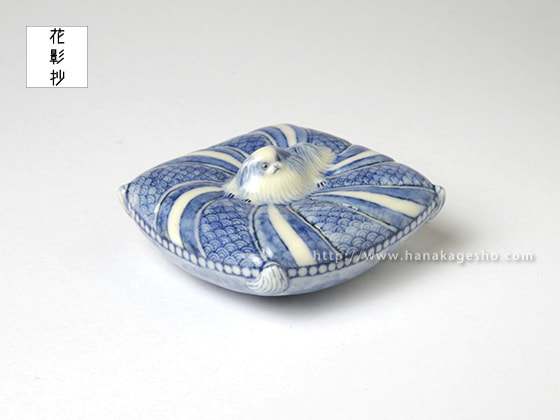 台風のときに使われるネットスラング「犬をしまえ」から連想して、常に家にしまわれている室内犬の狆を制作しました。青海波の座布団を海に、狆の長毛の流れを台風にそれぞれ見立てています。座布団の裏面は日本列島に近づく台風の図になっています。(由良薫子)