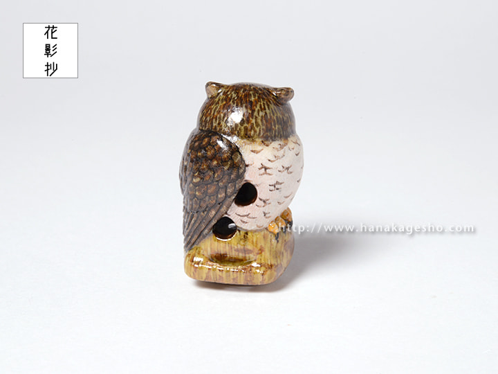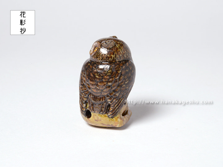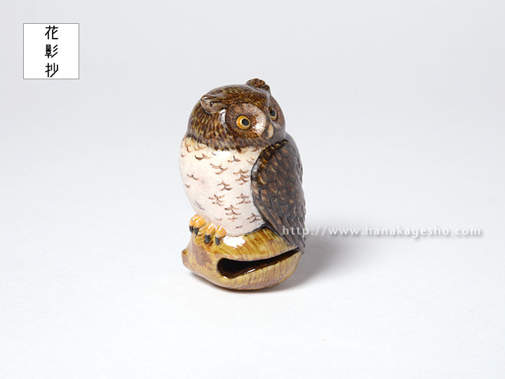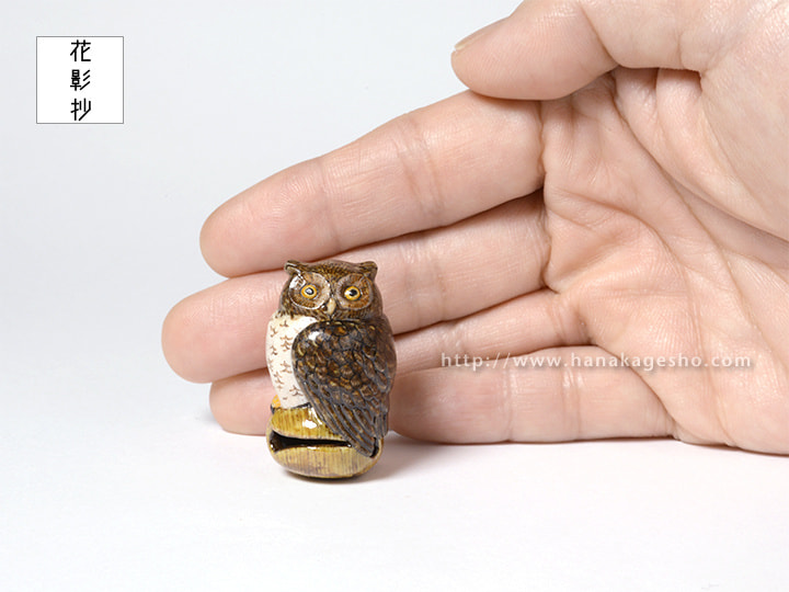木魚に乗るコノハズクの根付です。「ブッポウソウ(仏法僧)」と鳴く鳥はブッポウソウだと思われていましたが実際にはコノハズクの鳴き声です。(由良薫子)