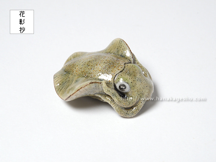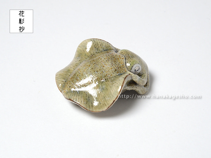 アオリイカの根付です。裏側ではイカ釣り用のルアー「エギ」に触腕を伸ばしています。(由良薫子)