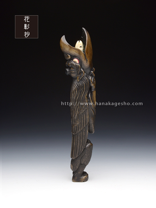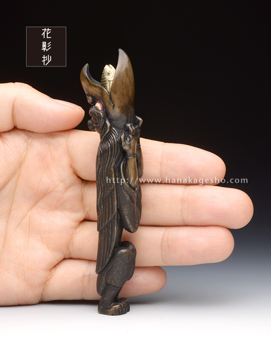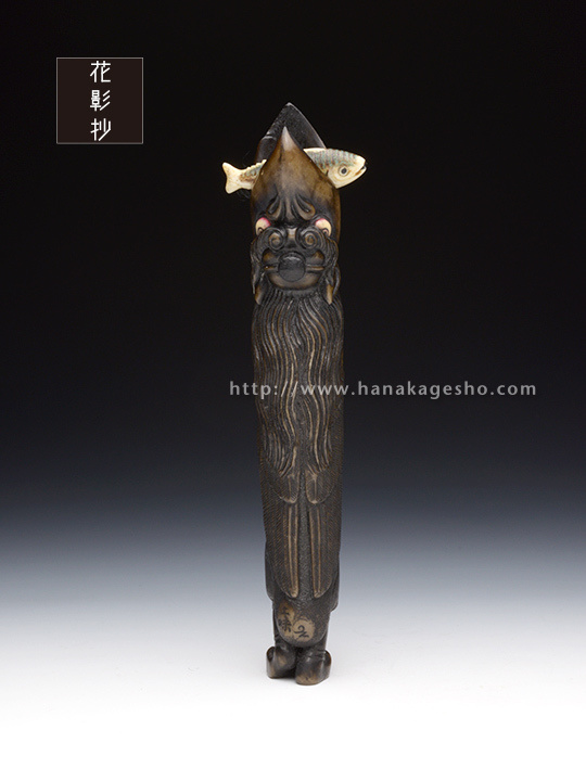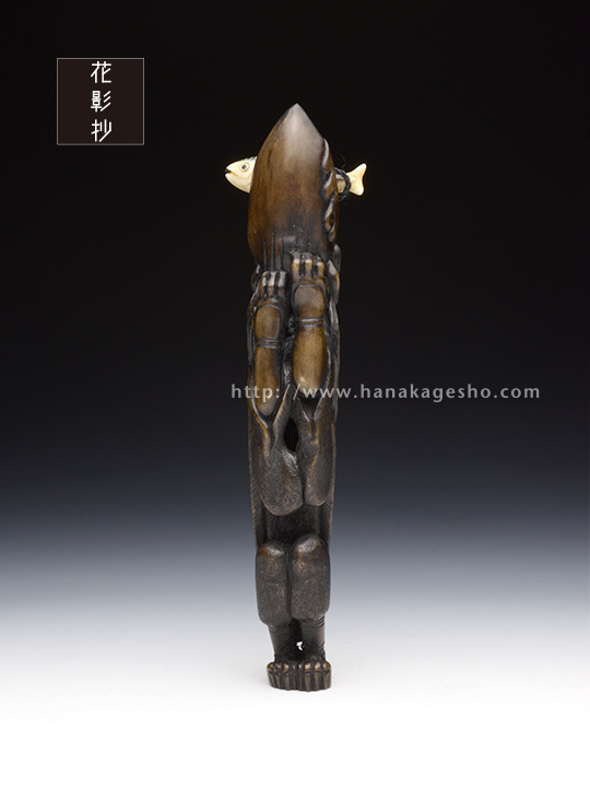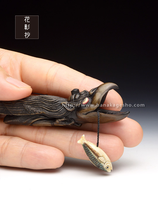 柳田国男の『山の人生』(大正15年)には、石川県の能美郡遊泉寺村で老人が神隠しに遭ったとき、村人が「鯖食った伊右衛門やい」と口々に唱えて探し歩いた、と書かれています。柳田のこの記述で、近代民俗学の分野から「天狗の鯖嫌い」は民間に広がっていったと考えられますが、歴史的に絵画や工芸の題材になってはおらず、この三昧の根付は同モチーフ初めての工芸化といえるかもしれません。 なぜ天狗は鯖が嫌いかということに関しては、鯖は古来より「産飯(サバ)」という音から転じて特別な霊力を宿す神饌と考えられていたようです。神に供える霊力が、人間を攫ったり悪戯をしたりの害を与える妖怪・天狗にとっては毒になるという考え方となり、「天狗は鯖を嫌う」発想に結びついたのでしょう。 |