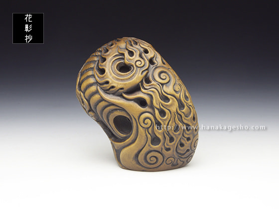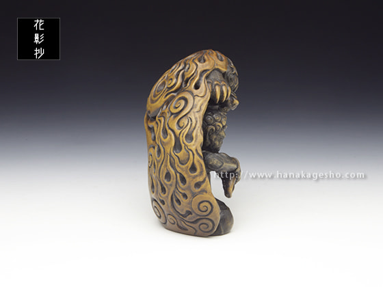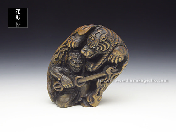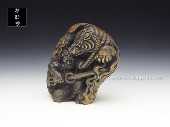 「この年(令和二年)新型コロナウイルス(COVID-19)の世界的流行により世界は多大な被害を受けています。江戸時代日本では、文政コレラが流行したとき“コレラ(虎列刺)”と当て字が付けられ“コロリと死んでしまう”とのことから“虎狼狸”という呼び名も広く用いられたそうです。今回の作品も、その当て字のヒントをいただき見えない敵を具象化してみました。そして“疫病退散”の守護神である不動明王と供に作品にしました。 令和二年五月十六日」(三昧)