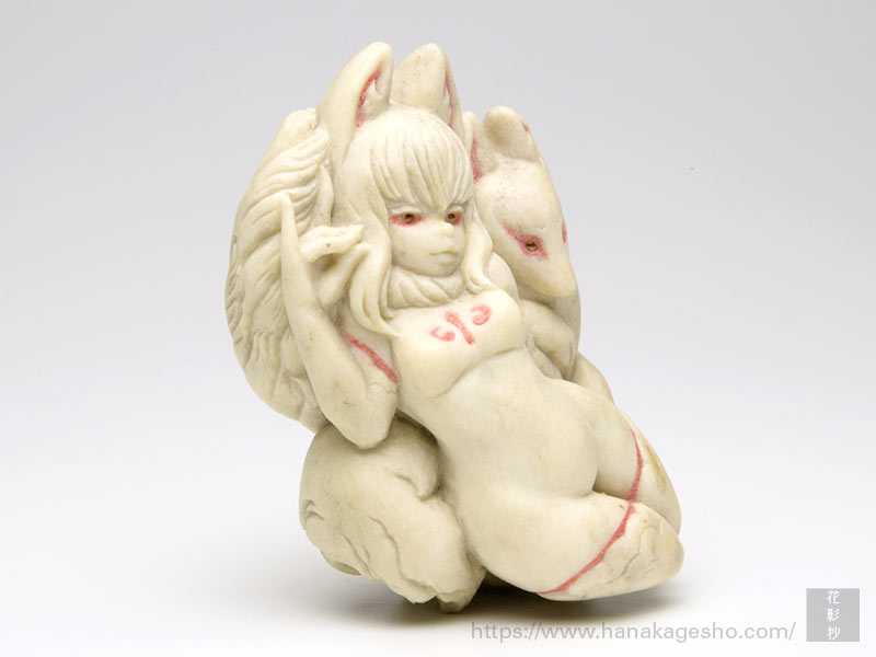 狐と言えばお稲荷様。豊穣の神です。この作品は狐娘と狐が寄り添っていますが、狛狐をイメージした部分もあります。仲の良い二匹の狐はウカノミタマのお遣い。後ろの狐面をだれに届けるのでしょうか。稲荷神社巡りでは狛狐を見るのも、僕の趣味の一つとなっています。都内だと赤坂の豊川稲荷別院が大きく狛狐もたくさんいますし、どことなく怪しい雰囲気もありおもしろいです。